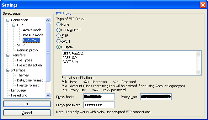 Click Edit – Settings from menu to open the FileZilla client settings. Expand FTP in the leftpane and click “FTP Proxy“.In the rightpane, select “custom” under “Type of FTP Proxy” and enter the following format specifications: