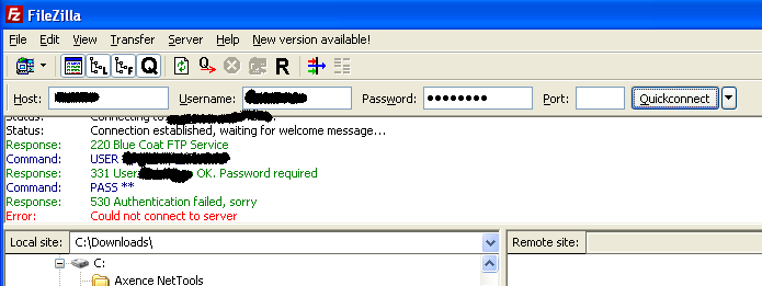 If you are attached to a corporate or an enterprise network and connect to internet from behind a BlueCoat proxy which proxies FTP connections then FileZilla FTP client needs needs to be configured accordingly to get it work properly. There is an FTP proxy configuration and a Generic Proxy configuration that can be set in FileZilla client.